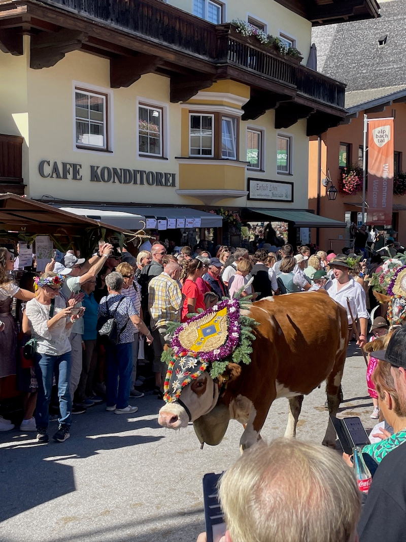 One of the things that makes the Almabtrieb so special is the elaborate decoration of the cows. The lead cows are adorned with huge headdresses made from pine branches, flowers, and ribbons. These decorations aren’t just for show; they are a symbol of thanksgiving. If the summer has passed safely, with no accidents on the mountain, then the cows are honoured with these colourful crowns.