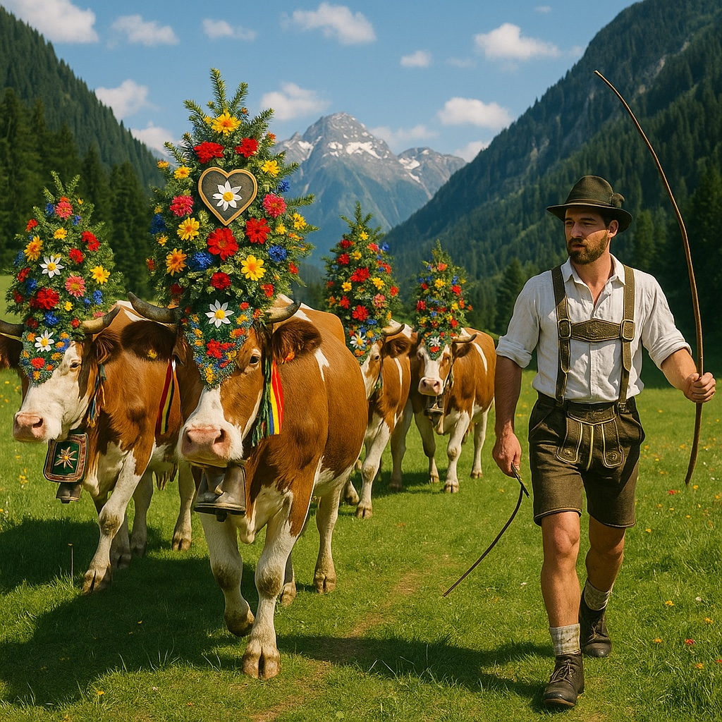 From June to September, cows are led up to the mountain meadows, known as Almen. Up there, the grass is rich, the air is cool, and the animals thrive. But once autumn arrives, the weather changes quickly in the Alps. Snow can fall overnight, and suddenly those lush meadows become dangerous places. So before the first heavy snowfall, the farmers gather their cattle and guide them back down to the safety of the valley farms. That journey is what we call the Almabtrieb.